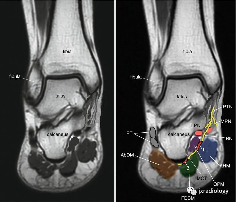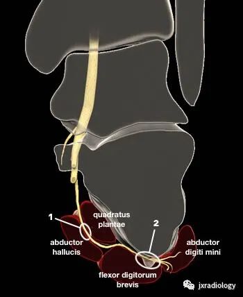 1、当神经穿过外展踇肌深筋膜(AH)和跖方肌内侧足底缘(QP)之间时。