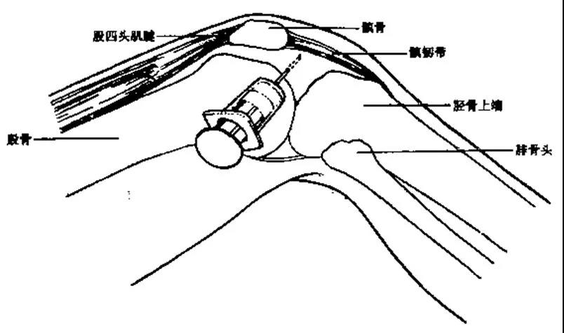 3、膝关节微屈30°左右,从髌骨下方的髌韧带内侧或外侧关节间隙垂直进针。