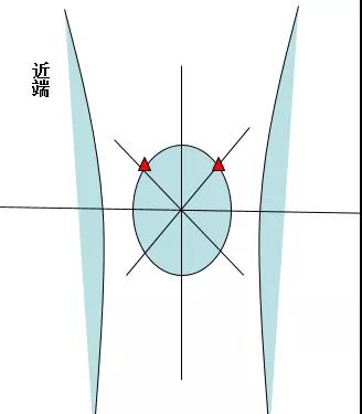 1、以髌骨中心点,作水平线和垂直线,其第一和第二象限,各做45度的平分角,该平分线与髌骨内外缘的交点,即是进针点。