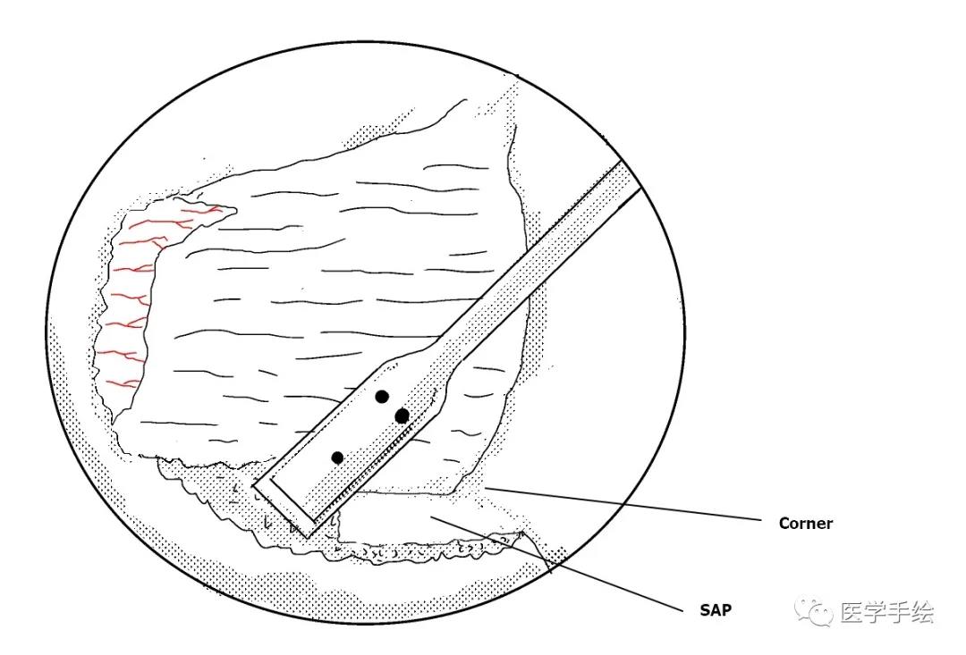 6. to exposure the corner and media margin of SAP by osteotomy(使用骨凿将磨薄的下关节内缘凿除显露Corner和上关节突内缘)