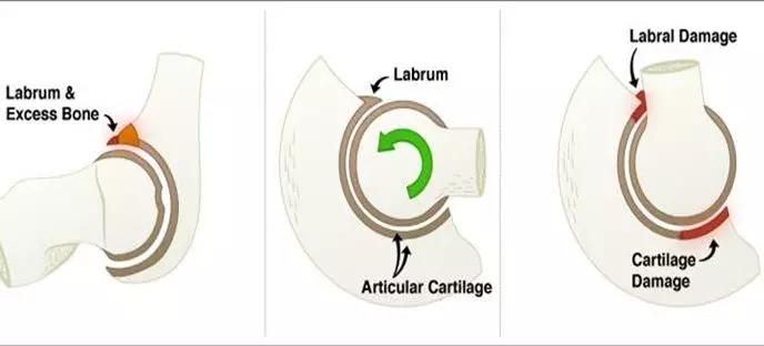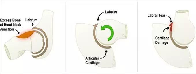 常见于经常运动的男性,常由股骨头的非球形部分或者宽展突出畸形的股骨颈在屈曲和内旋时挤压、碰撞并剪切髋臼软骨及髋臼唇,剪切力造成髋臼唇从表面向内部损伤及从髋臼上撕裂,髋臼软骨的损害通常发生在髋臼的前上部。