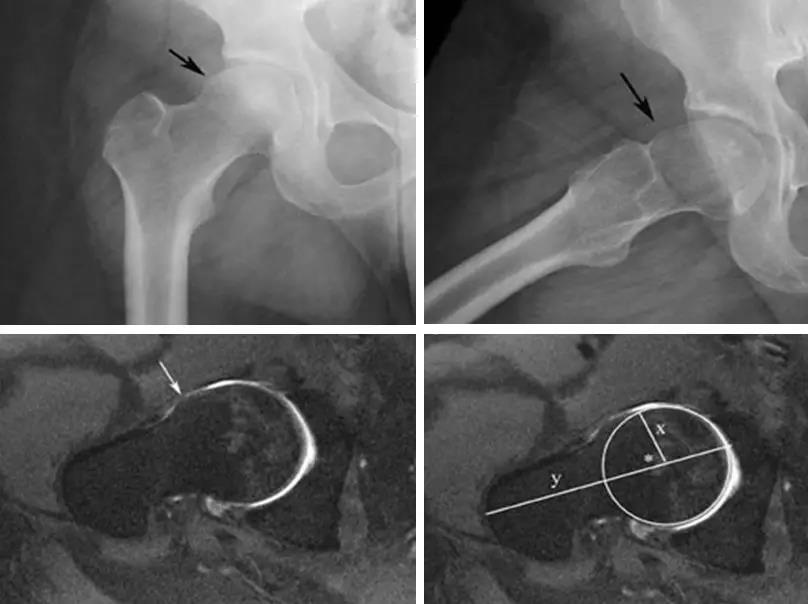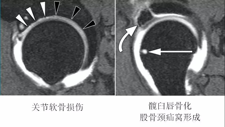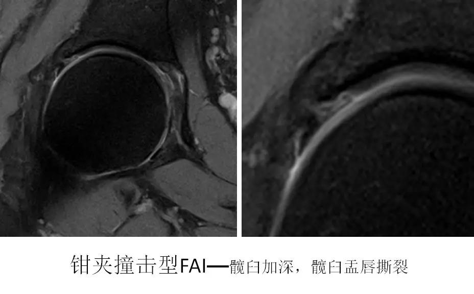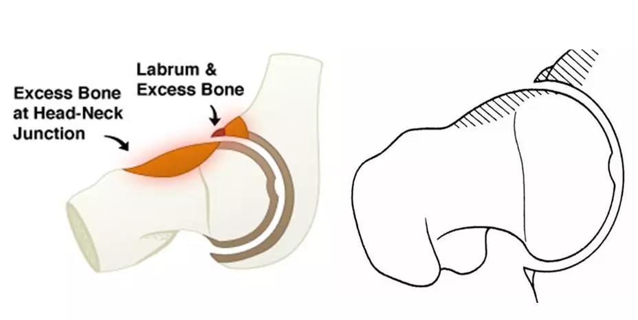 股骨头颈连接处和髋臼缘的异常接触,反复的撞击接触导致髋臼唇的变性,进一步引起髋臼内部囊性变以及髋臼唇周的骨化和髋臼加深。该慢性损伤常位于髋臼软骨周围的狭窄长条状区域。髋臼唇周围的变性通常以骨化形式表现。