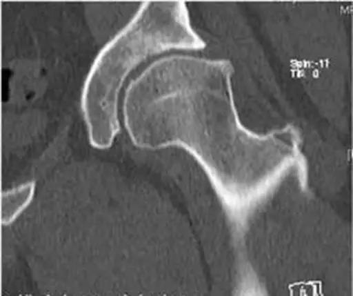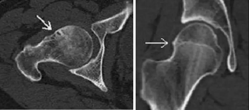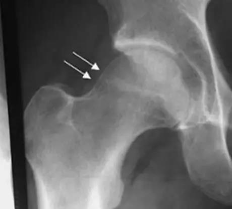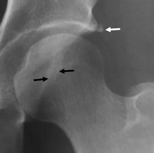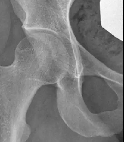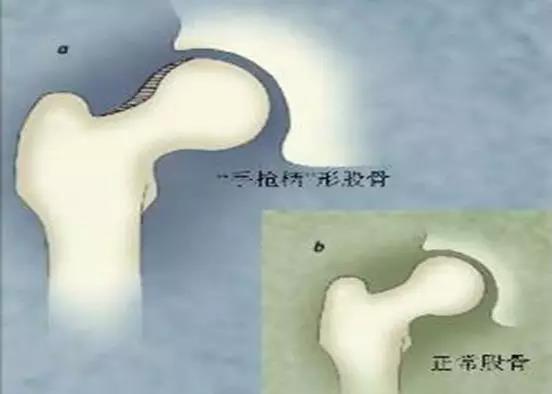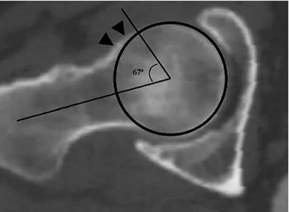 - 前部或前上部股骨头颈连接处骨质异常突出。