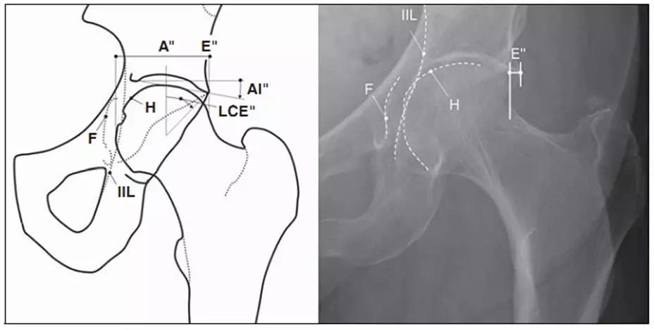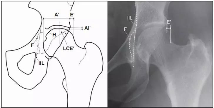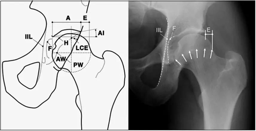 - IIL:髂坐线;AW:髋臼前壁缘;PW:髋臼后壁缘;A为股骨头被髋臼覆盖部分的宽度;E为股骨头未被髋臼覆盖部分的宽度;F为髋臼窝线。