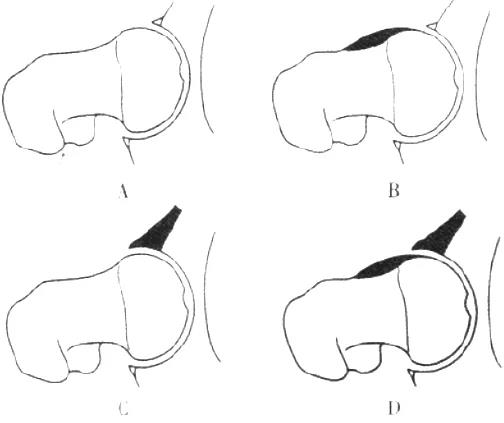 - 股骨头颈间的凹陷不足,伴局部的骨质增生。