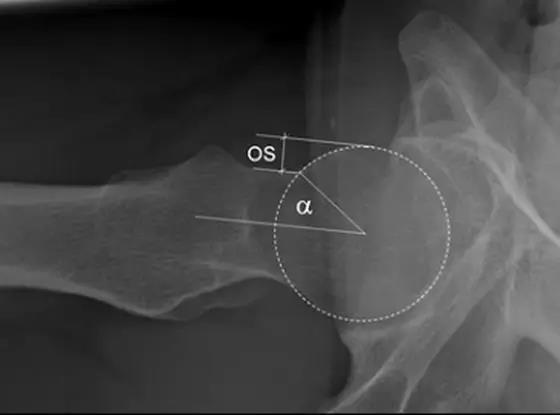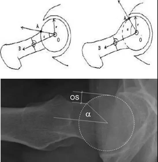 - 股骨头中心O点为圆心,股骨头正常最大半径为r,从股骨头颈连接处骨质与这个圆的交点(A点)到股骨头中心点作直线OA,此直线与股骨颈中轴线OB的交角为α角。
