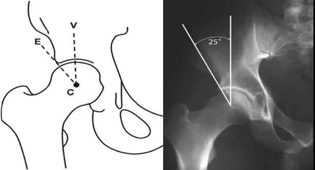 髋关节外侧CE角(lateralcenter-edge angle,LCEA或center-edgeangle of Wiberg):根据Wiberg的描述,在骨盆前后位X线片上,C点定义为股骨头的中心,E点为髋臼最外侧处。经过C、E两点的直线与身体中线的平行线之间的夹角即为LCEA。Ogata等定义了一种新的测量方法,即取髋臼侧软骨下硬化带的外缘为E点。正常值:>25°。<20°即可诊断髋关节发育不良。但是若LCEA>45°则说明髋臼有过度覆盖的倾向。
