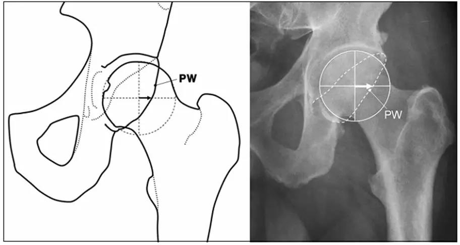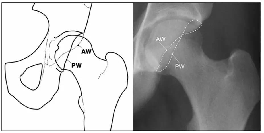 - 髋臼后壁过度覆盖:髋臼后壁缘位于股骨头中心的外侧,即后壁征。