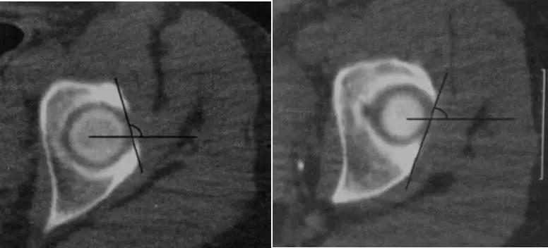 - 横断面显示髋臼后倾:正常髋臼连线与水平线呈钝角;呈锐角,提示髋臼后倾。