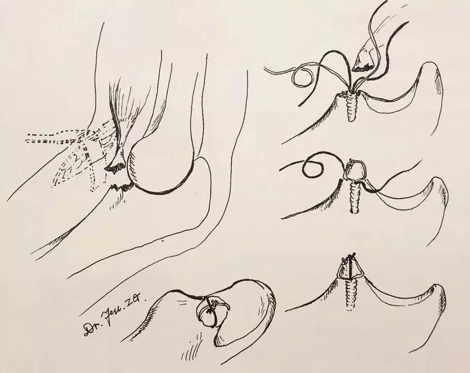 首先介绍台湾高雄市荣民总医院唐逸文医生提供的创新方法:先在尺骨冠状突骨折基底部正中置入双线锚钉,然后在冠状突游离骨块侧将4根缝线穿出骨块(图 9)。