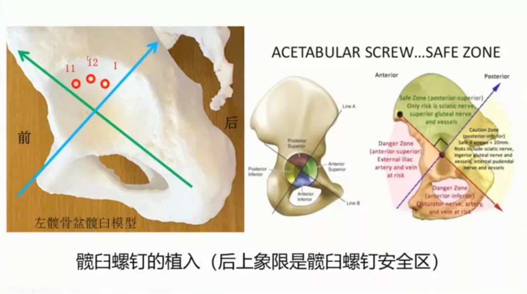 ②髋臼螺钉置入:螺钉偏前易损伤前方血管,偏后易损伤后方神经,后上象限骨质良好,且是髋臼螺钉置入的安全区。
