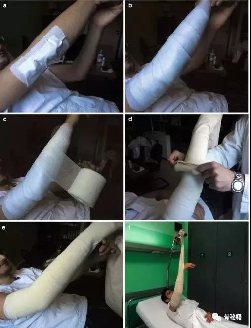 (a)将皮肤贴在皮肤切口上; (b)柔软的棉质衬垫位于肘部伸展的位置; (c)用单层半胶粘绷带覆盖; (d - e)将管状绷带缠绕在手臂上,手臂悬挂在患者头部12小时(f)