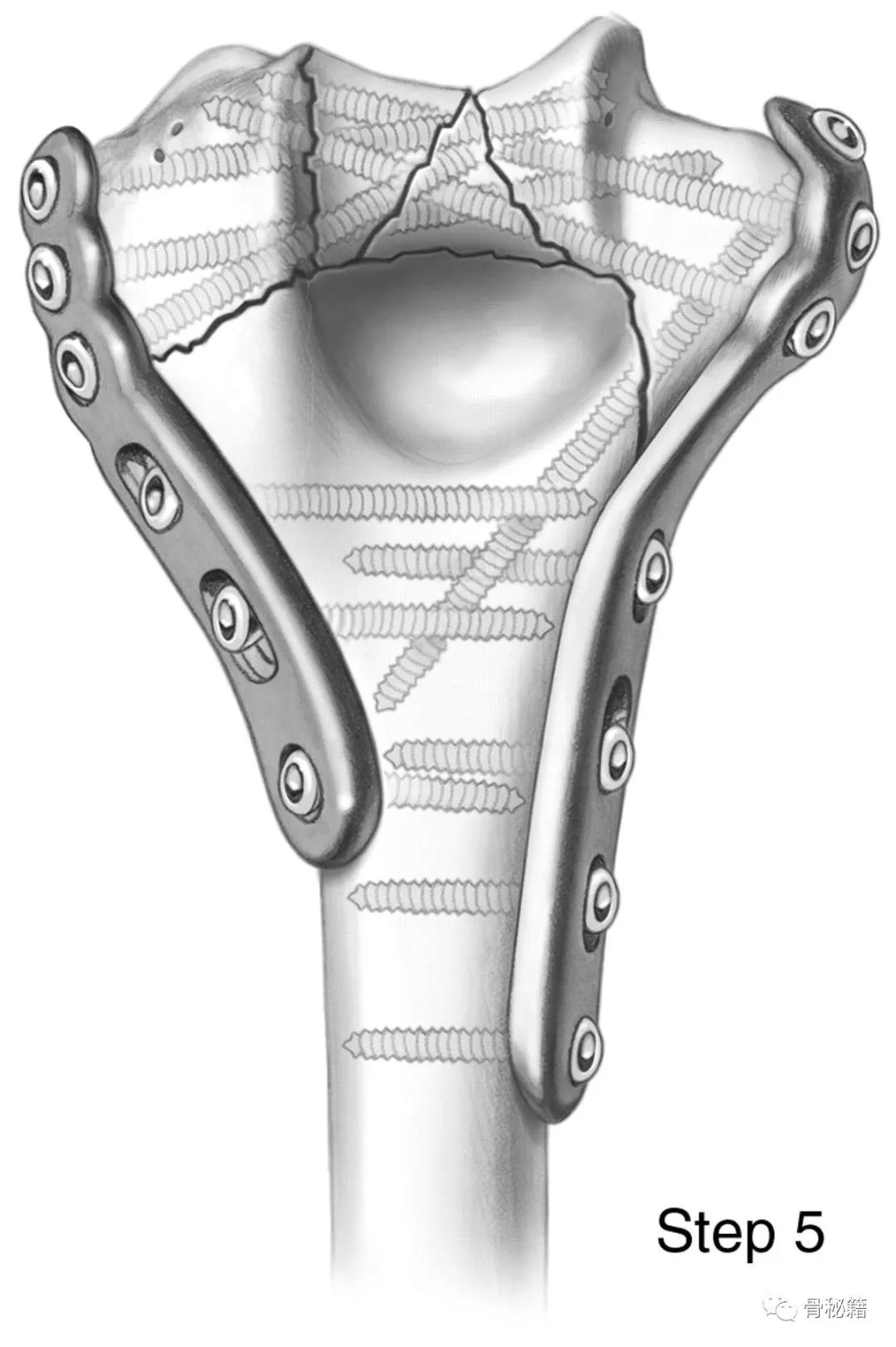 固定的八个细节:1、每个螺钉都应该经过钢板固定2、每个螺钉固定骨折块的螺钉,在他的对侧应该也有一个钢板的把持3、在远端一定要打满螺钉4、每个螺钉要尽可能的长5、每个螺钉需要尽量的对关节面的骨块进行固定6、螺钉应通过交叉锁定在一起,从而形成角稳定结构并将内外侧柱连接在一起7、钢板需要再髁间完成加压8、所使用的板必须足够坚固并且足够坚硬以抵抗在髁上水平处的断裂或弯曲。