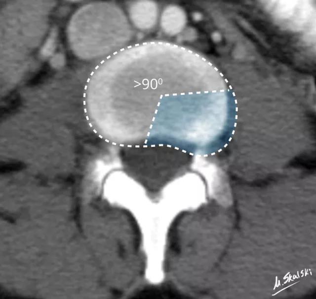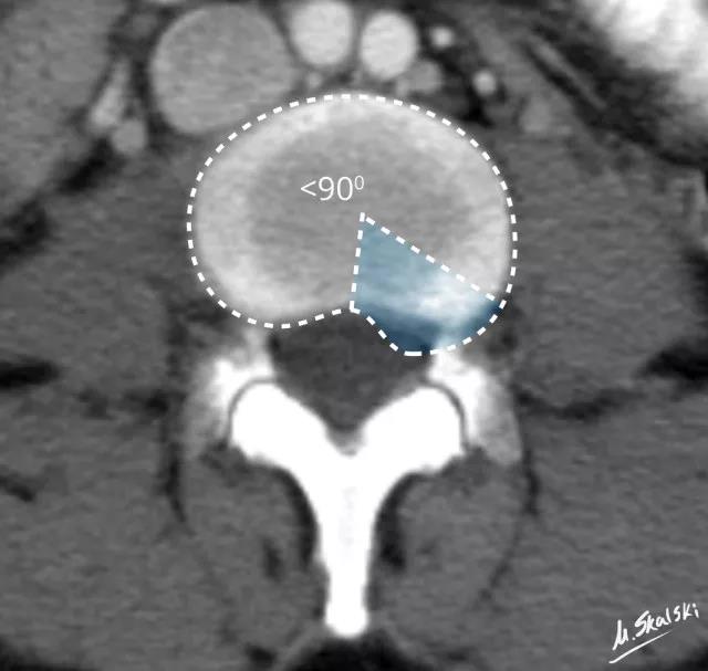 图 3 椎间盘膨出的影像学定义为突出部分>椎间盘边缘的25%,或者突出的两边与髓核的中心的夹角>90°