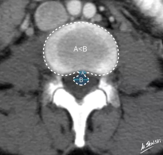 图 5 椎间盘突出的影像学定义为突出椎间盘的基底部(A)<突出组织的直径(B)