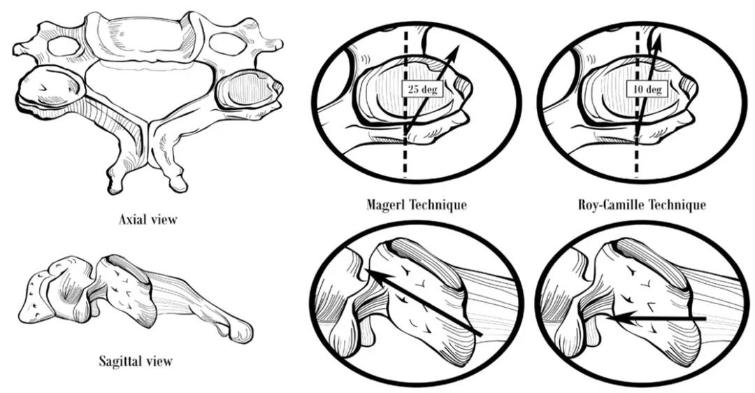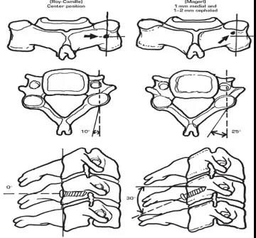 Magerl技术进针点:侧块中点内上1-2mm处方向:向头侧与上关节突关节平行(30-40°) 向外侧与矢状面成25°夹角。