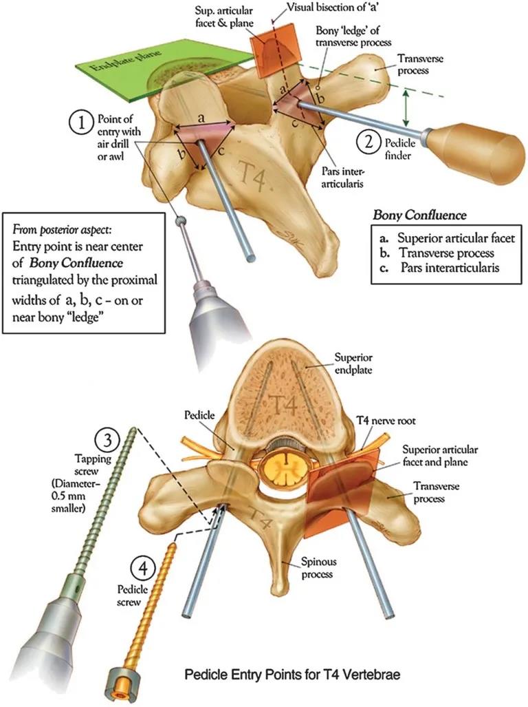 进钉技术是手术成功的关键:进钉点:颈、胸、腰各有不同。不同学者使用的定位参数、进钉点、进钉方向不尽相同;不同的个体、不同节段椎弓根存在形态学差异;有关进钉点选择的描述只能作为一个供选择的区域,而具体的选定必须结合影像学观察分析。