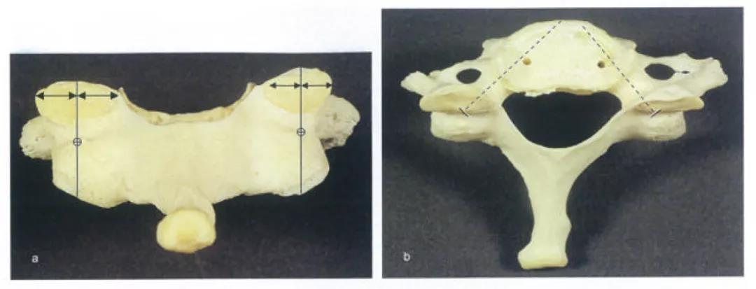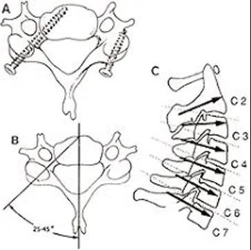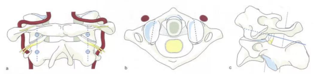 颈椎侧块:C1 颈椎侧块螺钉进钉技术寰椎的进针点和枢椎在一个纵线上;枢椎侧块的垂直平分线,向上延长与寰椎后弓交点为进针点。 方向:向头侧与上关节突关节平行(10°)
