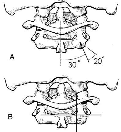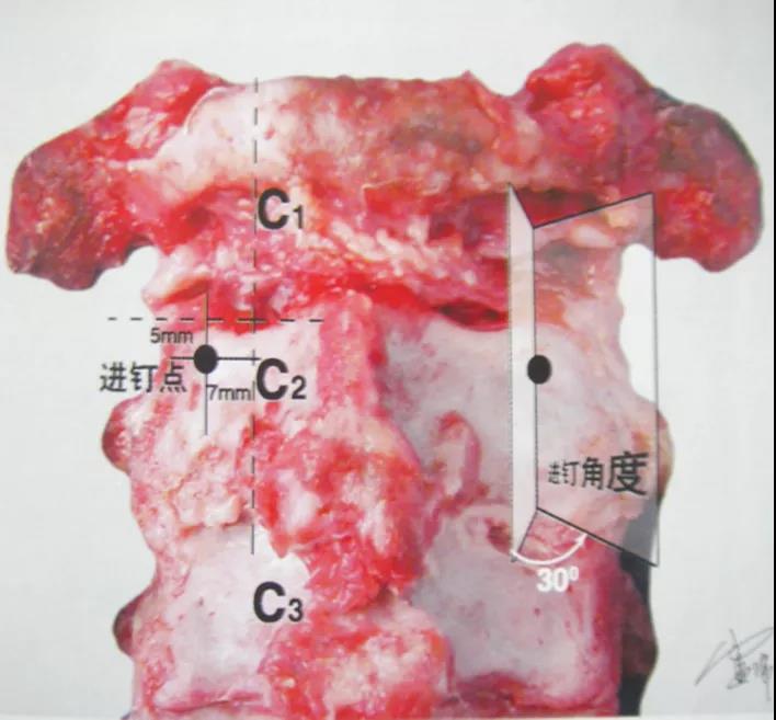 C2 椎弓根螺钉进钉点:C2 枢椎椎板上缘水平线下5mm与椎管内侧缘外7mm交点处。方向:矢状面内倾30°,水平面上倾20°