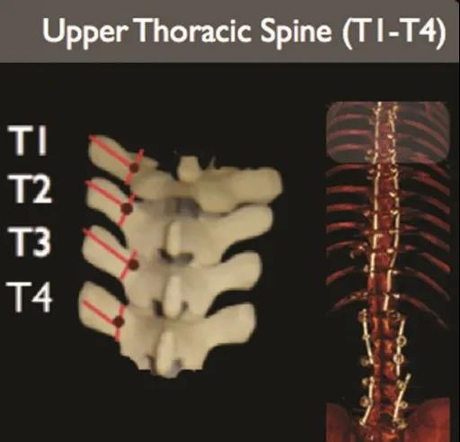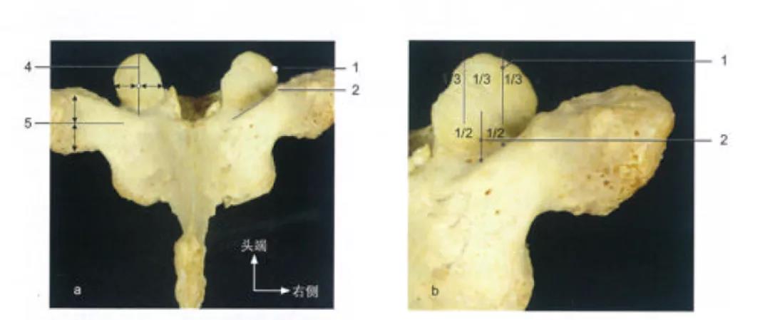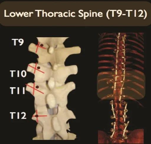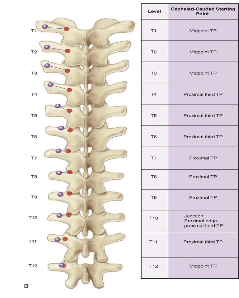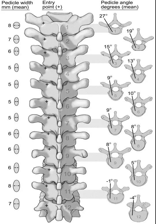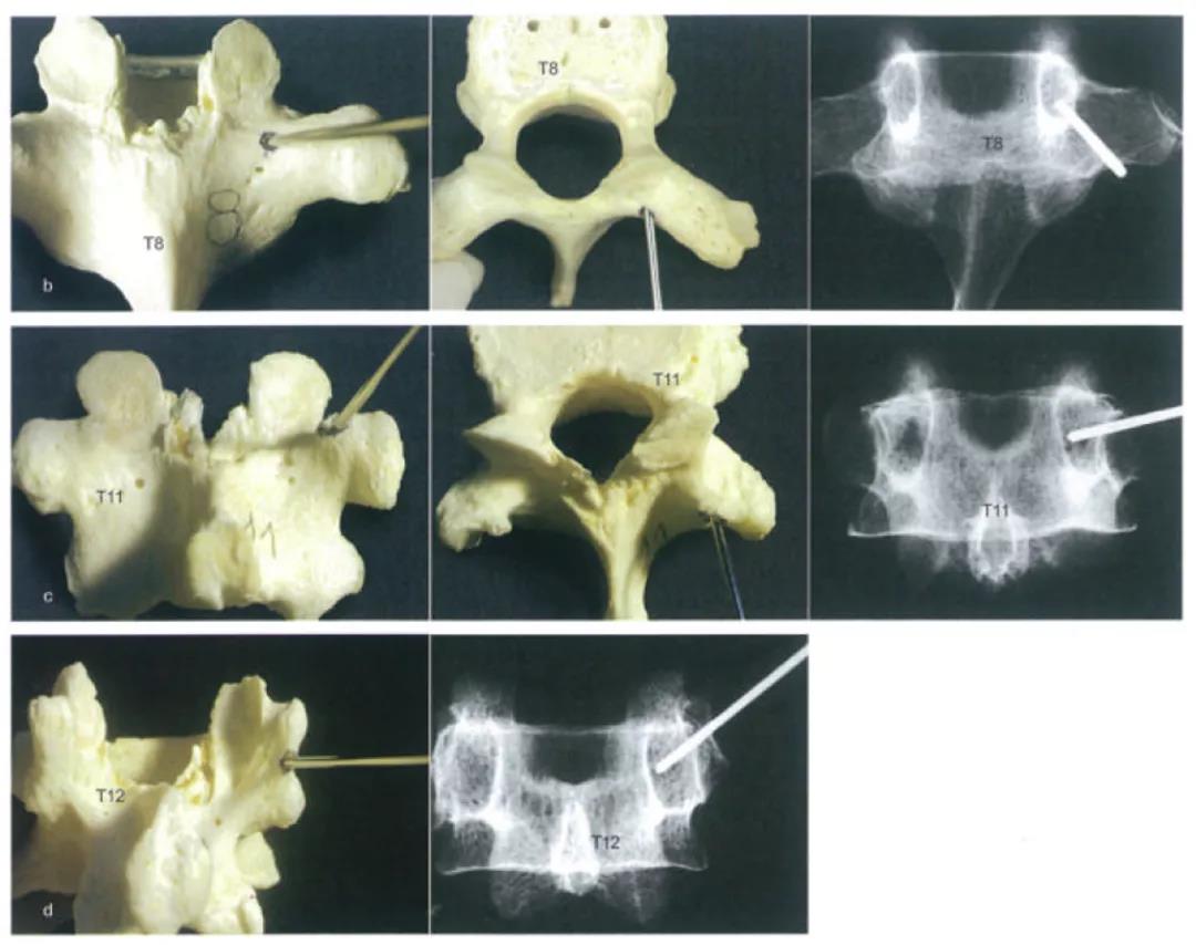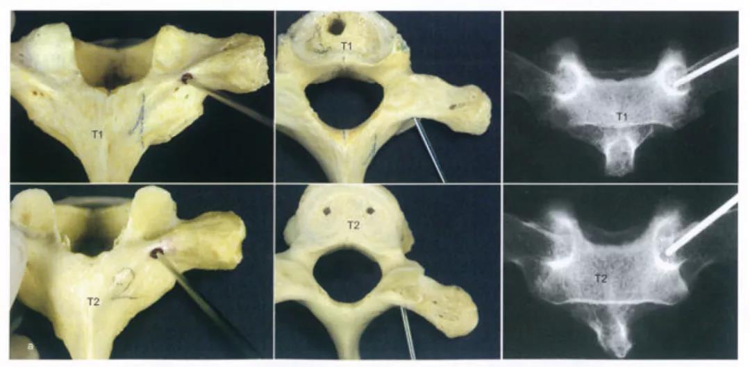 Ebraheim提出T1~T2椎弓根中心位于上关节突外缘内7~8mm,横突中线上3~4mm,T3~T12:位于上关节突外缘内4~5mm,横突中线上5~8mm。