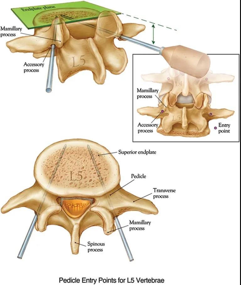 椎弓根螺钉置入一般有三个步骤:确定进钉点;把握进钉角度:—水平面角度(TSA)—矢状面角度(SSA);深度(椎弓根螺钉的深度及直径选择)