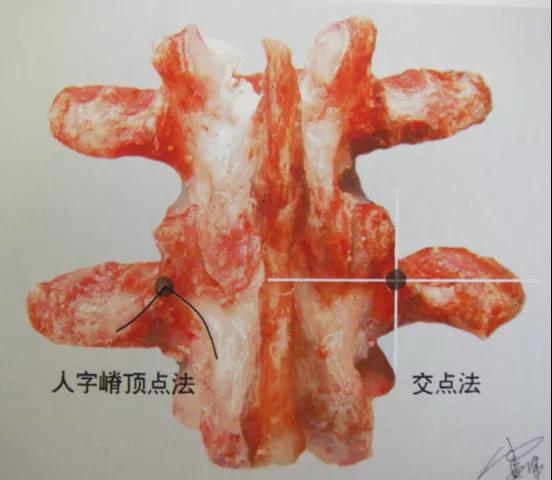 胸椎椎弓根螺钉进钉点:Magerl和Roy Camille以横突中点水平线与上关节突外缘垂线的交点为进钉点。
