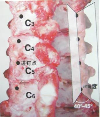 C3-C6 椎弓根螺钉进钉点:C3-C6 侧块背面中上1/4水平线与中外1/4垂直线的交点。方向:内倾40-45°,水平面与终板平行。