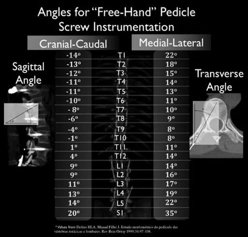 胸椎椎弓根螺钉进钉角度从T1到T12椎弓根内倾角度递减。上胸椎椎弓根螺钉应与矢状面呈10~20°的内倾夹角,中下段胸椎的椎弓根螺钉应与矢状面呈0~10°的内倾夹角。