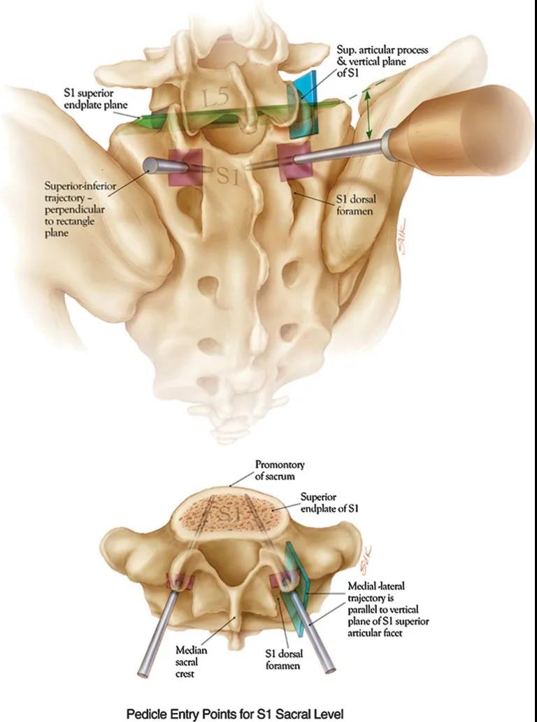 骶椎椎弓根螺钉进钉角度内倾10-15°,头倾25-30°,瞄向骶骨岬,进入软骨下骨。