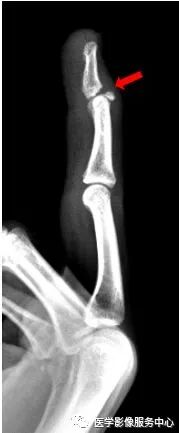 右手中指远节近端背侧关节处见游离骨片影,右手中指远节骨折。