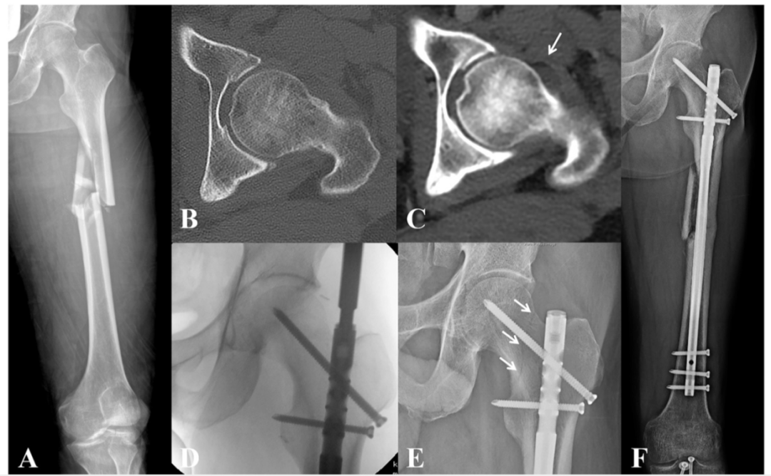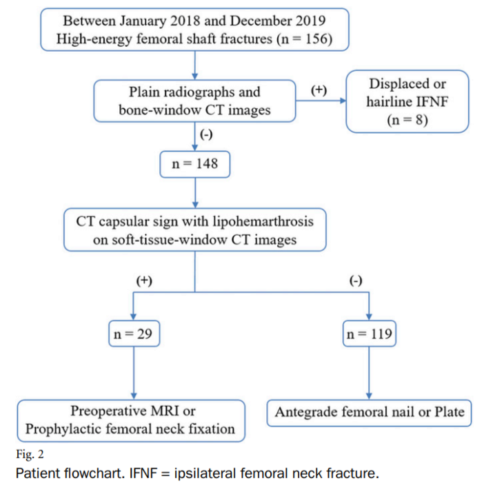 共连续纳入156名患者。8名患者术前被诊断为移位或轻微移位的同侧股骨颈骨折,而其余148名患者在X光片和骨窗CT图像上未显示同侧股骨颈骨折。在CT软组织窗图像上,148例患者中有29例(19.6%)CT囊性征阳性并伴有关节积脂血症。我们对3例患者进行了术前磁共振成像;在其余26名患者中,使用重建钉进行预防性股骨颈固定。我们在29例阳性患者中发现了5例隐匿性同侧股骨颈骨折:2例在术前MRI扫描中,2例分别在术后即刻的和术后6周的X线中被证实。在119名阴性患者中,未发现隐匿性同侧股骨颈骨折。所有隐匿性同侧股骨颈骨折均愈合,股骨颈无进一步移位。因此,不需要额外的计划外手术来治疗延迟诊断隐匿性同侧股骨颈骨折。[Results:One hundred and fifty-six consecutive patients were included. Eight patients were preoperatively diagnosed with a displaced or hairline ipsilateral femoral neck fracture, whereas the remaining 148 patients showed no ipsilateral femoral neck fracture on radiographs and bone-window CT images. On soft-tissue-window CT images, 29 (19.6%) of the 148 patients had a positive CT capsular sign with lipohemarthrosis. We performed preoperative MRI for 3 patients; in the remaining 26 patients, prophylactic femoral neck fixation was performed with a reconstruction nail. We identified 5 occult ipsilateral femoral neck fractures among the 29 patients with a positive sign: 2 on preoperative MRI scans, 2 on