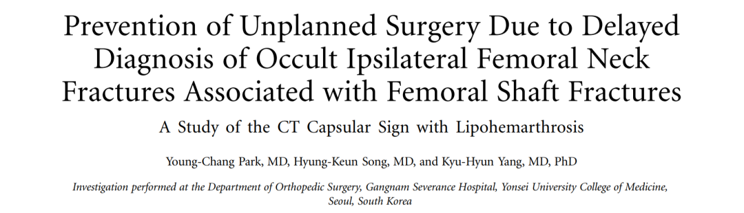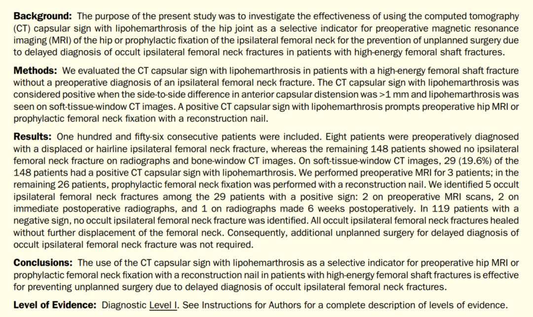 [Conclusion: The use of the CT capsular sign with lipohemarthrosis as a selective indicator for preoperative hip MRI or prophylactic femoral neck fixation with a reconstruction nail in patients with high-energy femoral shaft fractures is effective for preventing unplanned surgery due to delayed diagnosis of occult ipsilateral femoral neck fractures.]