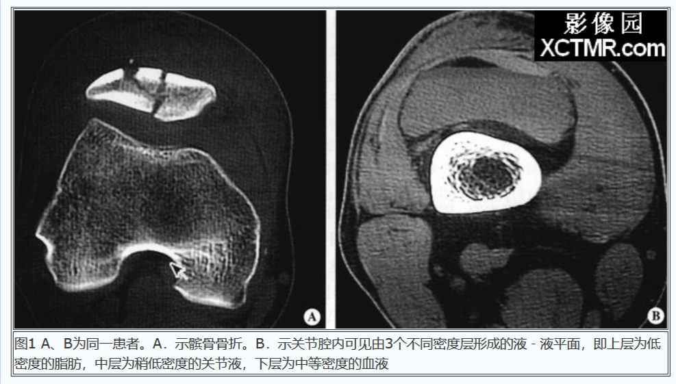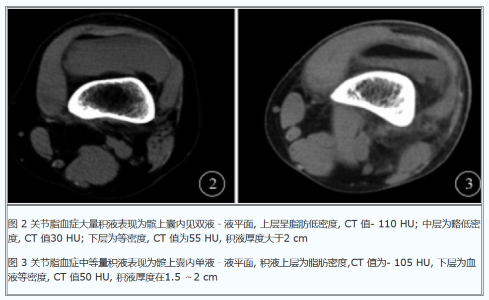CT表现:CT可以清楚地显示关节腔内的脂肪和血液及两者形成的液-液平面,有时还可以出现3层,即上层为脂肪,中层为关节液,下层为血液。关节囊内的脂肪CT值约为-130~-100 HU,而关节囊内的血液CT值约为10~30 HU。有时出血和关节腔积液分辨不清,常被笼统地认为关节腔积液。