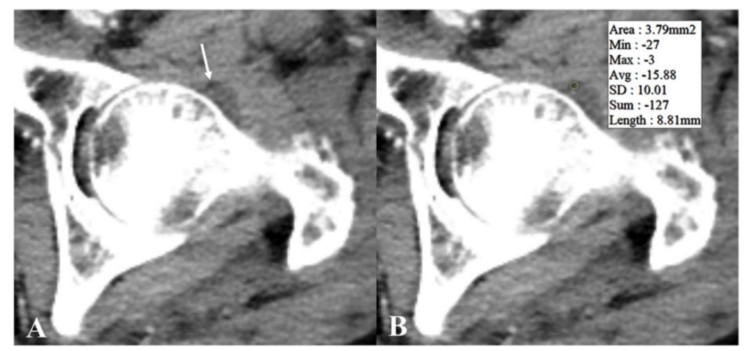 图1 CT软组织窗可见由关节积脂血症导致的囊性征(箭头所示)。测量图B黄色圈内CT值平均为-17。