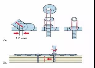 为了实现 Danis 提出的骨折断端加压理念,AO 设计了带有动力加压螺钉孔的钢板(Dynamic Compression Plate,DCP),原理如下图。