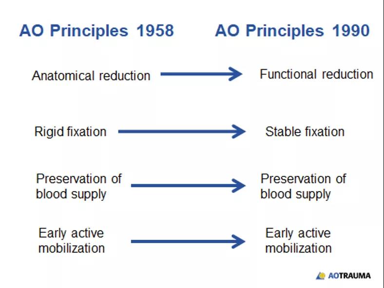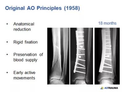1962 年提出了至今仍广为应用的 AO 原则:解剖复位、坚强(稳妥)固定、保护血液供应、早期功能锻炼。