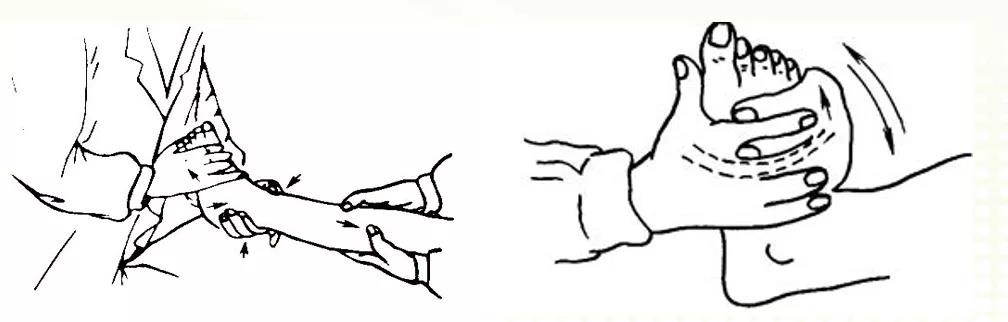 - 患者仰卧位或坐位,医者用按揉法于踝部,先从患部到周围,并逐渐向上经小腿到膝下