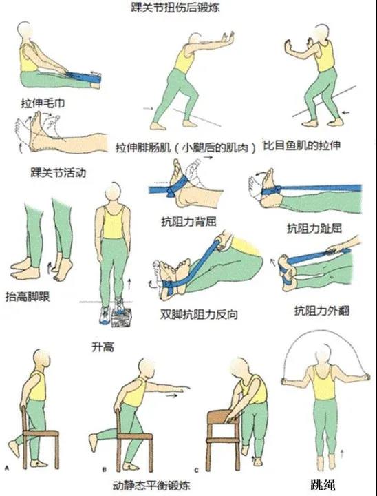 以弹力绷带为阻力,套在脚上,分别做勾脚、绷脚、足内翻以及足外翻的4个练习小动作,每个动作要以最大的幅度用力去伸屈,稍作停顿6-8秒后慢慢放开。以上所有动作每次反复做5-10次,休息30秒,每天做3组,当肌肉力量增加后,可以慢慢加大锻炼力度,但值得注意的是一定要避免运用大腿的力量来对抗。