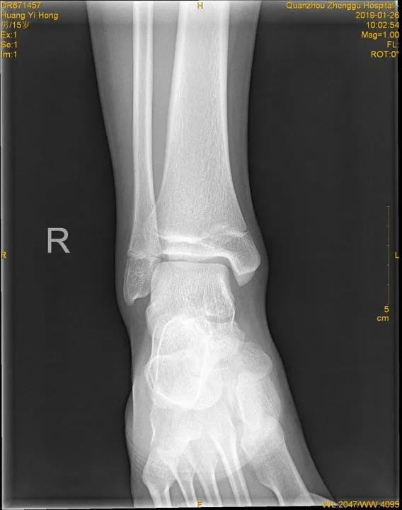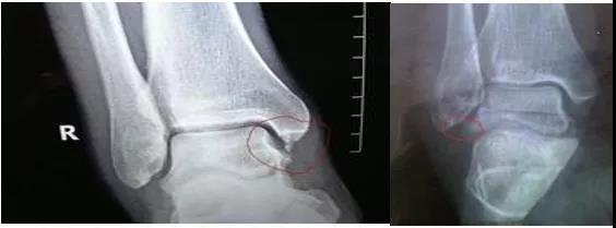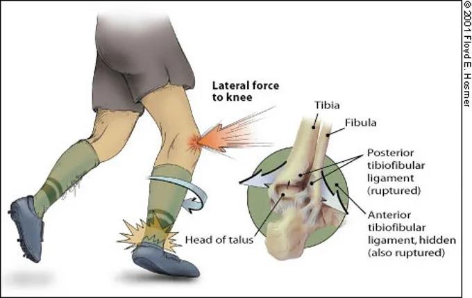 外旋位扭伤受伤时距骨受到外旋外力,或小腿内旋距骨受到相对外旋外力。随着外旋暴力增大下胫腓联合主要韧带断裂,下胫腓联合分离。严重的多合并外踝骨折或内侧韧带断裂。