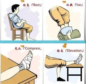 - R:休息(REST)。发生损伤时要停止运动,让伤部休息,减少出血和肿胀,避免二次受伤和加重损伤。脚踝扭伤后,休息是很必要的,暂时限制肢体活动,有利于损伤韧带的修复,如敷药加上休息可以大大缩短治疗时间。一般脚踝扭伤需要修养2周~3周。