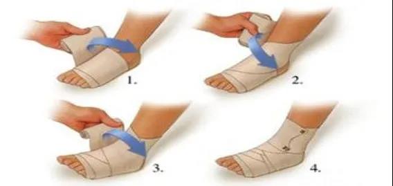 - C:加压包扎(COMPRESSION)。用弹性绷带包扎受伤部位,如足、踝、膝、大腿等部位,以限制关节活动,来减少内部出血,减轻肿胀及淤血,促进吸收和消肿,可连续加压包扎。但不可加压过度,否则可能引起包裹以远的肢体过度肿胀、缺血。