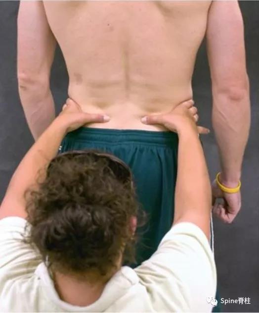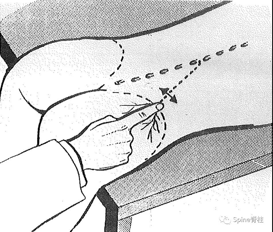 体征:在臀上皮神经经过髂骨嵴处有明显压痛点(trigger point),并向臀部放射疼痛,有时可触及髂周条索状结节。触诊时需先定位髂后上棘,沿髂后上棘向外约6-7cm,且后正中线向外7-8cm可定位到压痛点,这对明确诊断臀上皮神经卡压综合征非常重要。Tinel征可阳性,可查及臀上部感觉减退或痛觉过敏,但肌肉收缩运动无影响,取坐位或弯腰时患者疼痛加重。