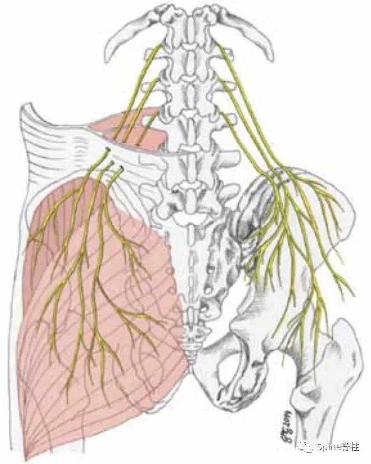图:臀上皮神经是由L1-3脊神经后外侧支组成的,从胸腰筋膜穿过到达臀上皮肤。