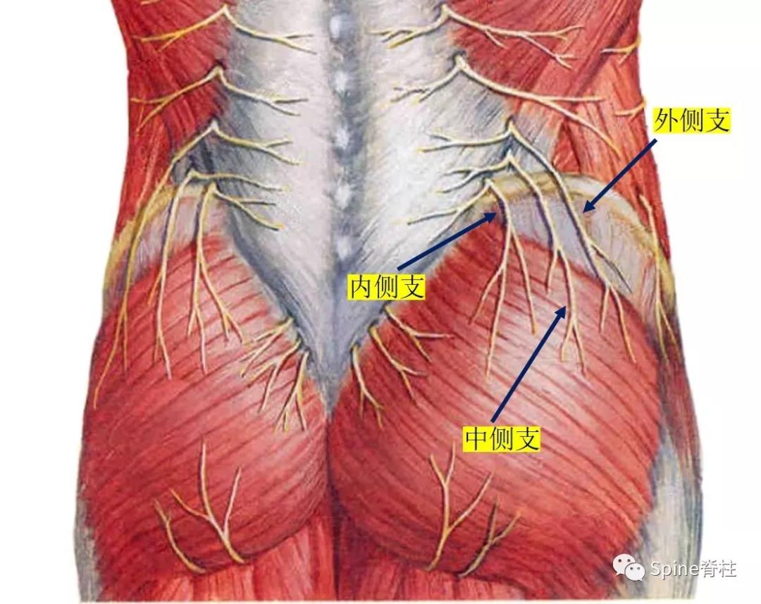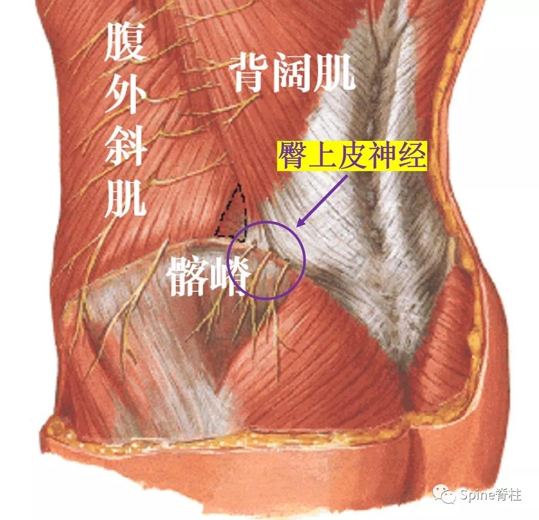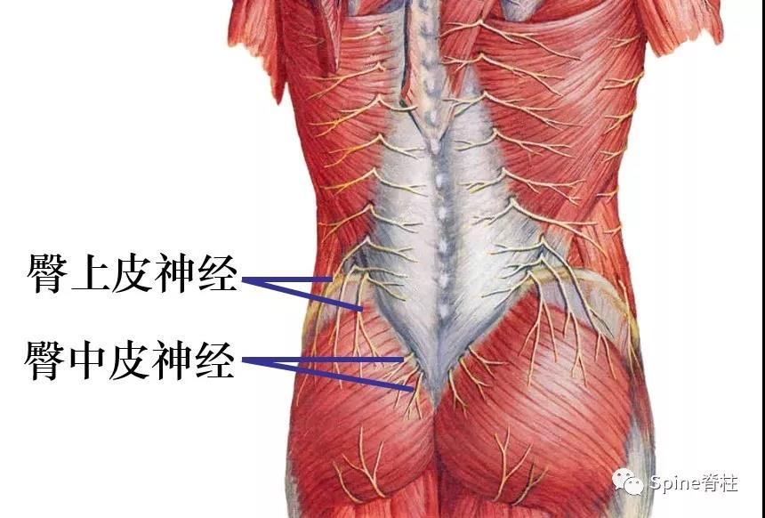 臀上皮神经主要分三支,内侧支、中侧支和外侧支,穿过髂骨嵴的内侧支距后正中线约7-8cm,距髂后上棘约6-7cm。这个解剖距离很重要,找压痛点时,后正中线及髂后上棘是个很好的解剖标志。