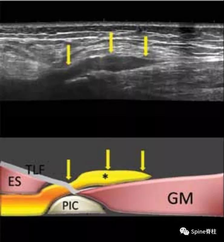 图:黄色箭头指向为臀上皮神经的内侧支,TIF为胸腰筋膜,PIC为髂后嵴,ES为竖脊肌,GM为臀中肌,*为纺锤样低回声病变