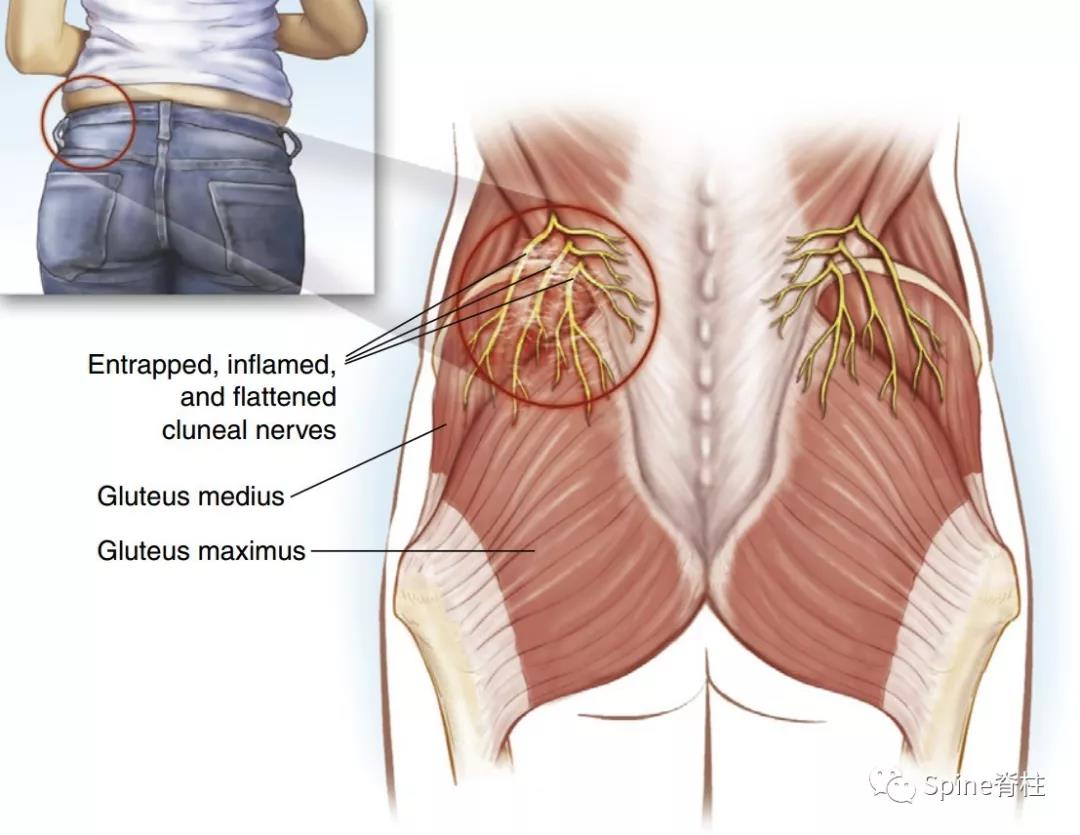 在臀上皮神经的3支中,又以内侧支和中侧支容易被卡压,类似于腕管综合征中正中神经被卡压一样,容易出现神经支配区疼痛、麻木或感觉迟钝或痛觉过敏。