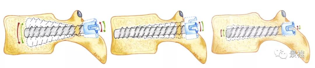 根据杠杆原理推断,如果钉子拧得不够深,钉尾晃动导致钉子在椎体里乱涮(左)。如果钉子进入椎体前皮质就稳了(中),但有损伤血管的危险。那钉尾顶入进针点皮质,是不是也一样稳(右)?