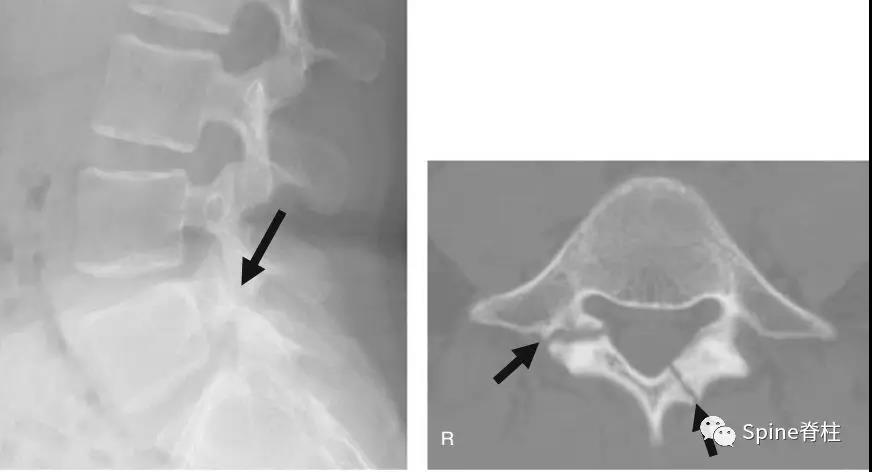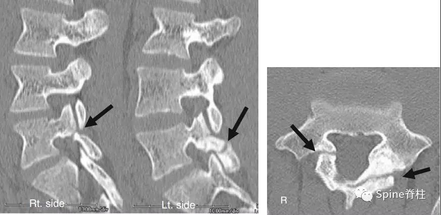 图:L5半椎板裂15岁篮球运动员,严重腰痛,影响睡眠CT示:左侧为椎板裂(箭头),右侧为峡部裂(箭头)