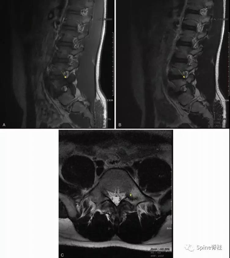 图:15岁腰痛男孩,左侧腰5椎弓根裂A:T1左侧腰5椎弓根低信号(箭头);B:T2左侧腰5椎弓根高信号(箭头);C:T2轴位左侧腰5椎弓根骨折线明显,伴高信号区(箭头)
