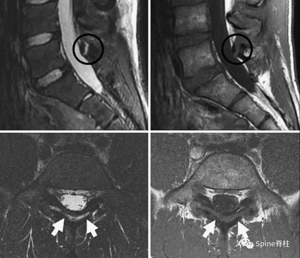 图:L5全椎板裂15岁相扑运动员,严重腰痛,后伸明显加重正侧位X线示椎板水平骨折线(白箭头)。MRI示T2椎板高信号,T1椎板低信号